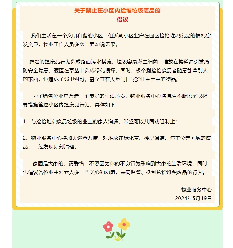 共創(chuàng)文明社區(qū)|嚴禁在小區(qū)內(nèi)撿拾堆積垃圾廢品的倡議
