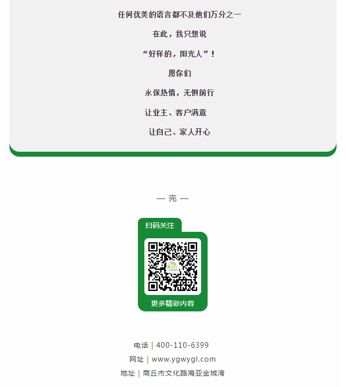 陽光物業(yè)成立于2003年5月,專注物業(yè)服務(wù)行業(yè)20余載,陽光物業(yè)現(xiàn)為河南省物業(yè)管理協(xié)會副會長單位、商丘市物業(yè)管理協(xié)會副會長單位,公司注冊資金1020萬元,陽光物業(yè)連續(xù)多年被河南省及商丘市評為先進(jìn)企業(yè)、優(yōu)秀企業(yè)。