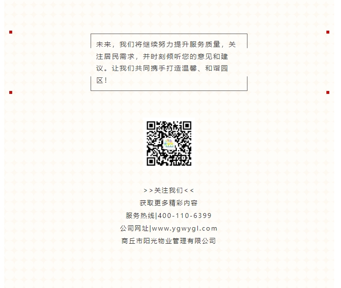 陽光物業(yè)成立于2003年5月,專注物業(yè)服務行業(yè)20余載,陽光物業(yè)現(xiàn)為河南省物業(yè)管理協(xié)會副會長單位、商丘市物業(yè)管理協(xié)會副會長單位,公司注冊資金1020萬元,陽光物業(yè)連續(xù)多年被河南省及商丘市評為先進企業(yè)、優(yōu)秀企業(yè)。